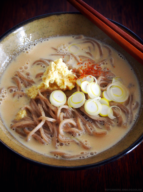 1、フライパンに豆乳、水、しょうゆを入れ沸騰させる。
