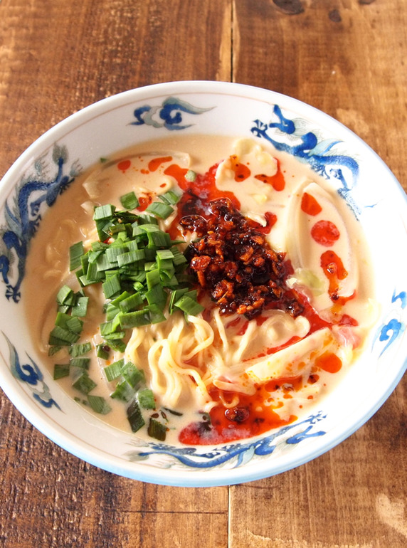 ねぎ、ラー油、ごま油、こしょうをトッピングする。
